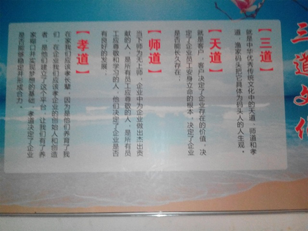 就是中華傳統(tǒng)文化中的天道、師道和孝道,漁家碼頭把它具體為碼頭人的人生觀。